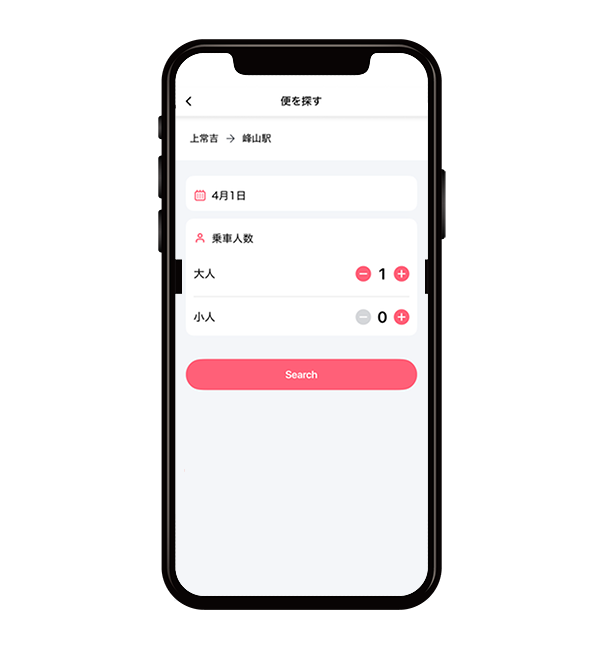 乗車人数を選択します。入力が完了したら、「Search」ボタンをタップします。
