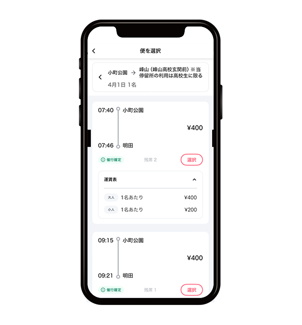 選択した日付で運行している便の一覧が表示されます。ご希望時間帯の便の「選択」ボタンをタップします。