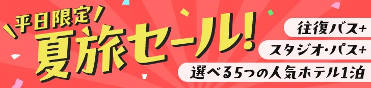 往復バス、ホテル、スタジオ・パスがセットになったプランや日帰りでも楽しめる往復バス+スタジオ・パス付きプランなど