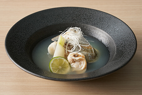 丹後ぐじとは水揚げから流通まで徹底した品質管理と厳しい選別基準をクリアした『京のブランド産品』その丹後ぐじのアラからとった出汁と蛤の出汁を合わせた潮仕立て。