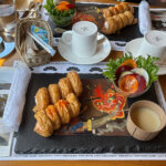そして驚いたのが、お料理の豪華さ。なんとお料理が8種類に、デザートが2種類!どれもお酒に合う味付けで、量もちょうど良かったです。地元の有名料理店「アメイロビストロアルル」監修と言うだけあって、お味はもちろん、見た目の美しさも楽しむことができました。どのお料理も、地元舞鶴や宮津・京都の食材がふんだんに使用されています。
