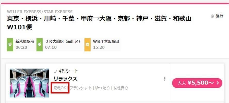 【WILLER TRAVEL】充電OKの高速バス・夜行バスを探す